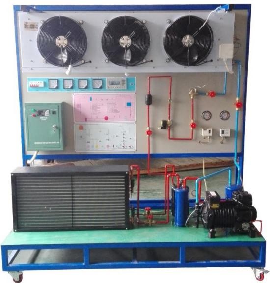 工業(yè)制冷系統(tǒng)實訓考核裝置主要由半封閉式制冷壓縮機、冷凝器、蒸發(fā)器、膨脹閥和故障設置開關、測試儀表等組成。實訓臺通過手閥開關和鈕子開關分別來設置管路系統(tǒng)和電控系統(tǒng)的 20 多種故障。設備采用先進的電控系統(tǒng)并具有具有開相,缺相, 過流等保護功能。蒸發(fā)器風扇采用變頻器控制速度。配備 8 路溫度計,電壓表,電流表,功率表,功率因數(shù)表和壓力表,能實時觀察運行參數(shù)